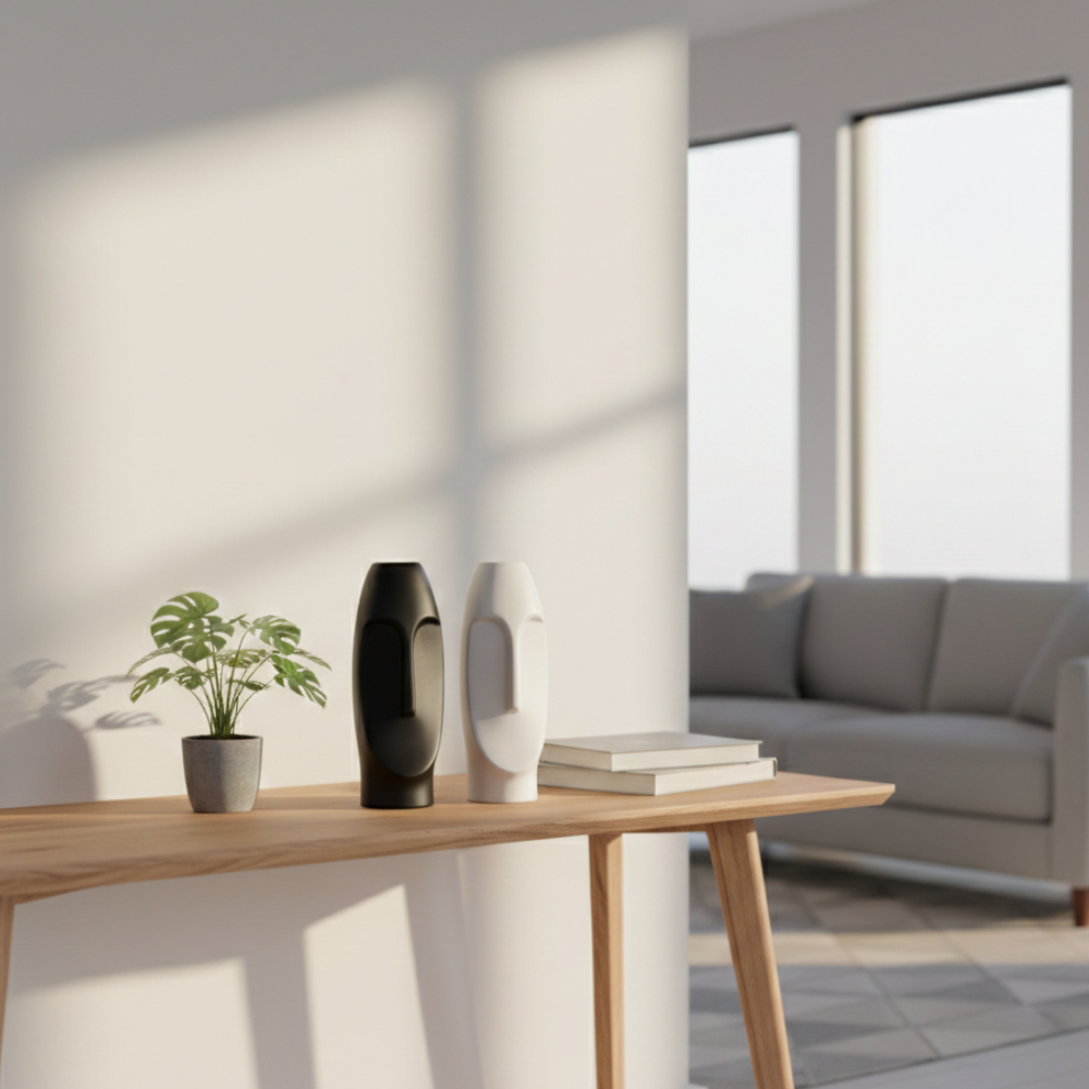 Elevate your interior with this striking abstract face sculpture vase from Nakshatraone. Designed in a contemporary minimalist style, the smooth sculptural form in classic black and white creates a bold artistic statement. Perfect as a decorative vase or standalone art object, this modern piece blends seamlessly with luxury, modern, and artistic interiors, adding depth, character, and sophistication to any space.