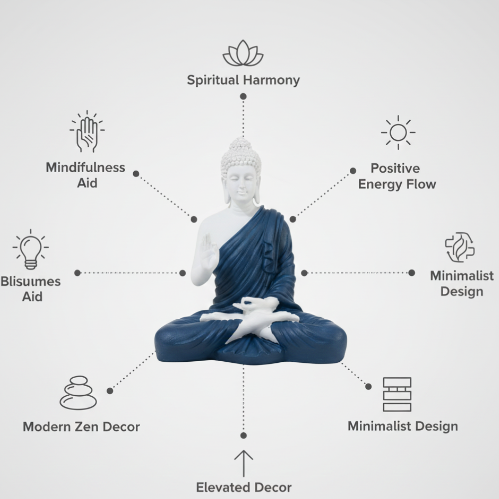 Ideal for home décor, meditation rooms, yoga spaces, or office interiors, this Buddha statue enhances positive energy and creates a tranquil atmosphere. Its minimalist design and soothing color palette make it a perfect addition to both modern and traditional interiors, as well as a thoughtful gift for spiritual occasions.