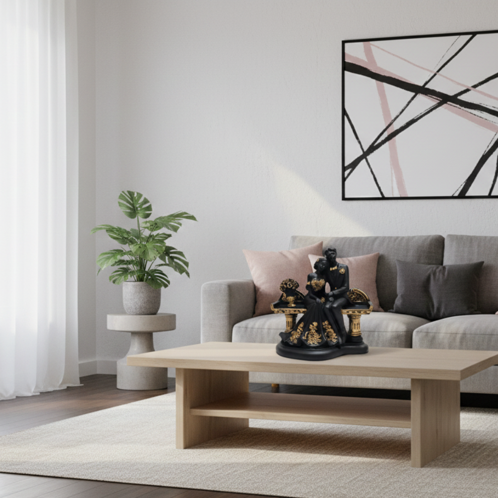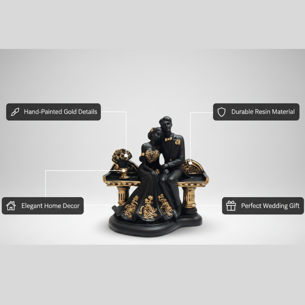 Enhance your living space with this elegant romantic couple sitting statue by Nakshatraone. Designed with fine detailing and a premium black and gold finish, this decorative showpiece adds charm to tabletops, shelves, and display units. The artistic posture and refined craftsmanship make it suitable for modern interiors, bedroom decor, living rooms, and office spaces. A thoughtful decorative choice for special occasions, celebrations, and interior styling.